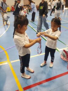 運動会を終わって、みんなメダルをもらって、好きな友達と一緒に写真を取りました。