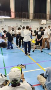 親子ゲームなので、子供たちは同じカバーを掛けて、同じ帽子を被って、親たちが自分の子供を探すゲームでした。