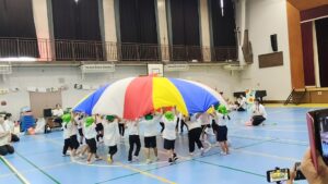 みんな力を合わせ、空気を入れて大きく膨らませたり、しぼませたりしました。