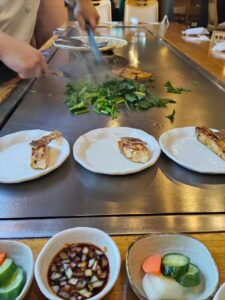 まず前菜、香物、タレを出してくれました。その後シェフが目の前で料理を焼いてくださるので、食べるだけじゃなくて見ても楽しめて、娘はずっと見ました😋😋