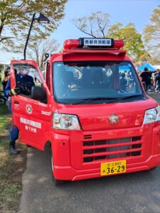 二日目はA地区で救急車の中に入って、雰囲気を体験しました。消防車にも乗り、消防服を着て写真を撮りました。